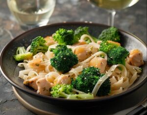 V isti ponvi stopimo maslo, dodamo sesekljan česen in ga pražimo 30 sekund. Nato dodamo smetano in parmezan ter dobro premešamo, da nastane gladka omaka. Dodamo odcejene NUTRIFIT fettuccine, brokoli in piščanca. Dobro premešamo, začinimo s soljo in poprom ter pustimo kuhati 1–2 minuti na srednji temperaturi, da se okusi povežejo.